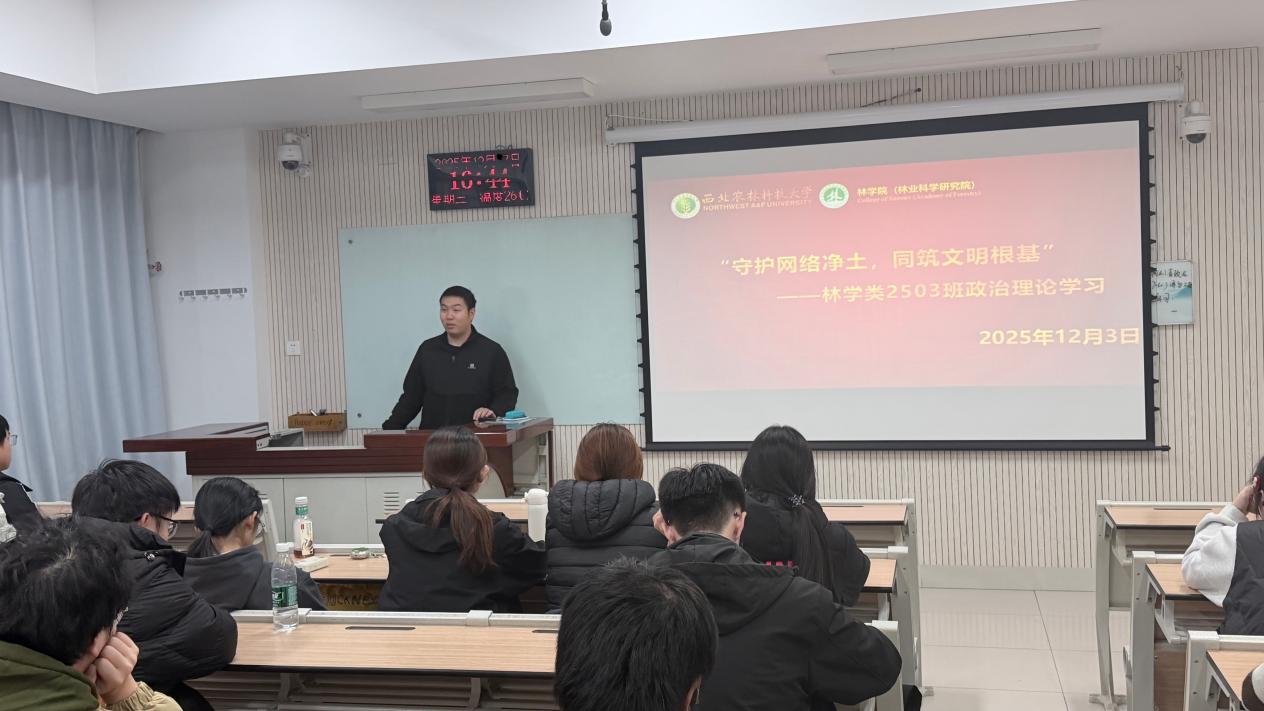 2025年12月3日,林学类2503班团支部第十三周政治理论学习围绕“健全网络生态治理长效机制,持续营造风清气正的网络空间”为主题在北校区八号教学楼开展。本次学习聚焦中共中央政治局第二十三次集体学习中提出的网络生态治理新要求、新部署,探讨新时代大学生在网络生态建设中的责任与使命,推动理论学习与网络实践深度融合。