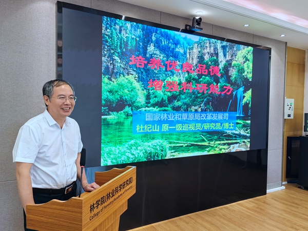 9月4日上午,国家林业和草原局改革发展司原一级巡视员杜纪山研究员在77779193永利官网行政楼515会议室,为我院师生作“培养优良品德 增强科研能力”专题报告。院长王利兵研究员主持会议,40余名师生参加本次报告。